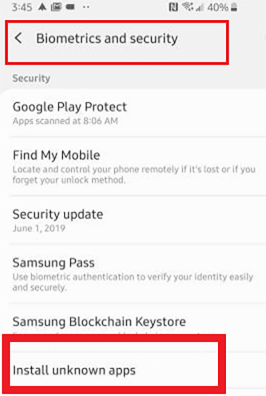 2. Go to Biometrics and security and tap on the Install unknown apps